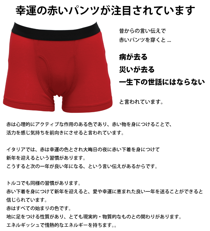 【幸運の赤いパンツが注目されています】 昔からの言い伝えで 赤いパンツを穿くと... 「病が去る」「 災いが去る」「 一生下の世話にはならない」 と言われています。
